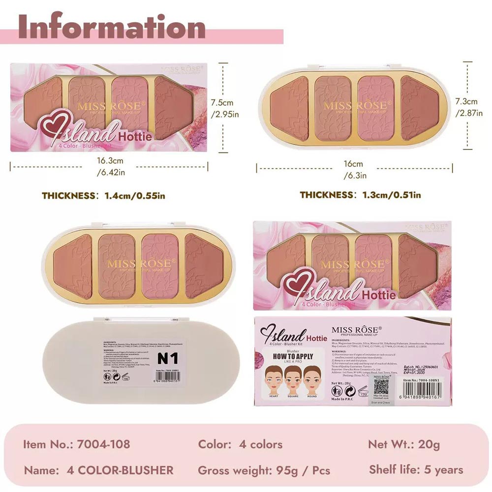 The Miss Rose 4 Color Blusher Kit referred to as the ButterBlend 4-Color Blush Palette is a compact makeup palette featuring four highly pigmented powder shades designed to provide a natural-looking flush.